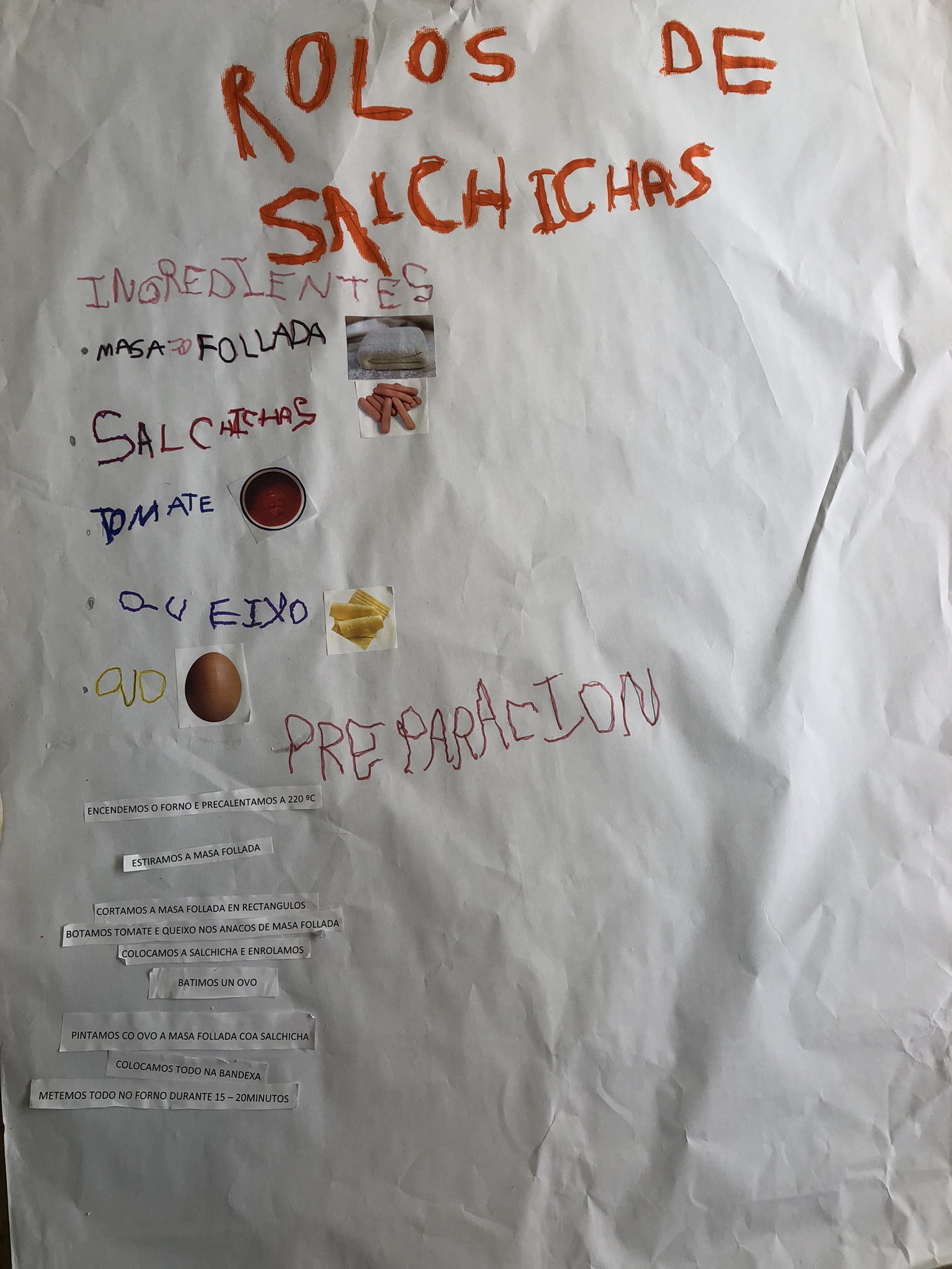 Escollimos entre varias e a elexida foi " rolos de salchicha" . Traballamos os ingredientes que precisabamos e cales eran os pasos que tiñamos que seguir. Entre todos escribimos a receita nun papel continuo.